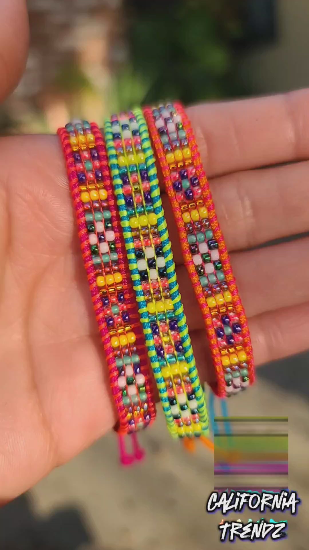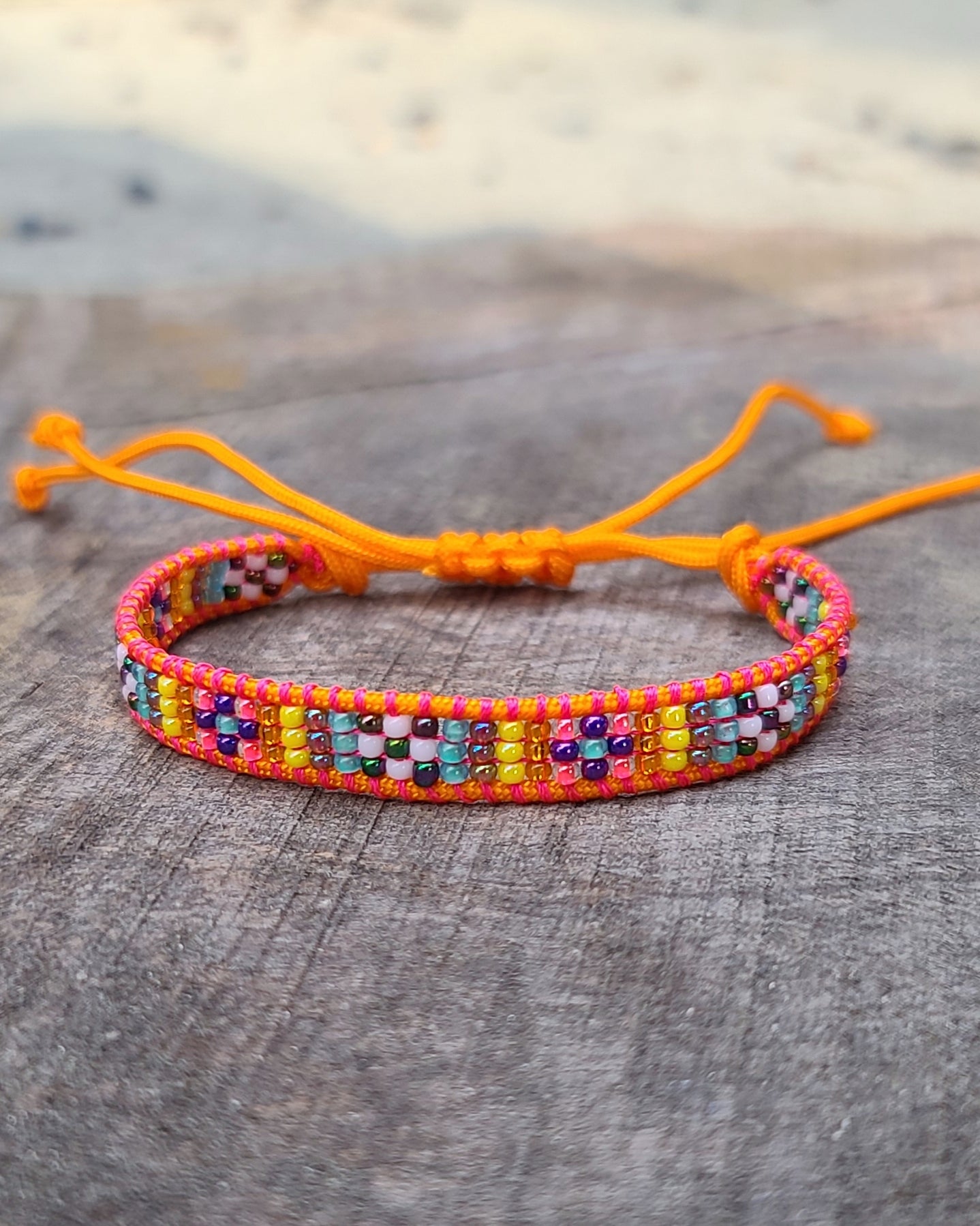 Bracelet features tiny glass beads arranged in a mosaic of bright colors on orange nylon cord.