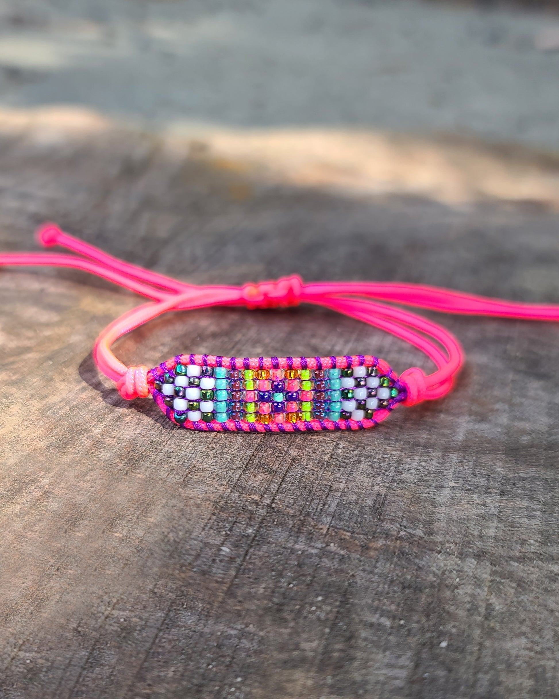 Bracelet features tiny glass beads arranged in rainbow colors on neon pink nylon cord. Perfect for any occasion and also glows under black light with UV reactive beads. Lightweight and flat making it super comfortable to wear.