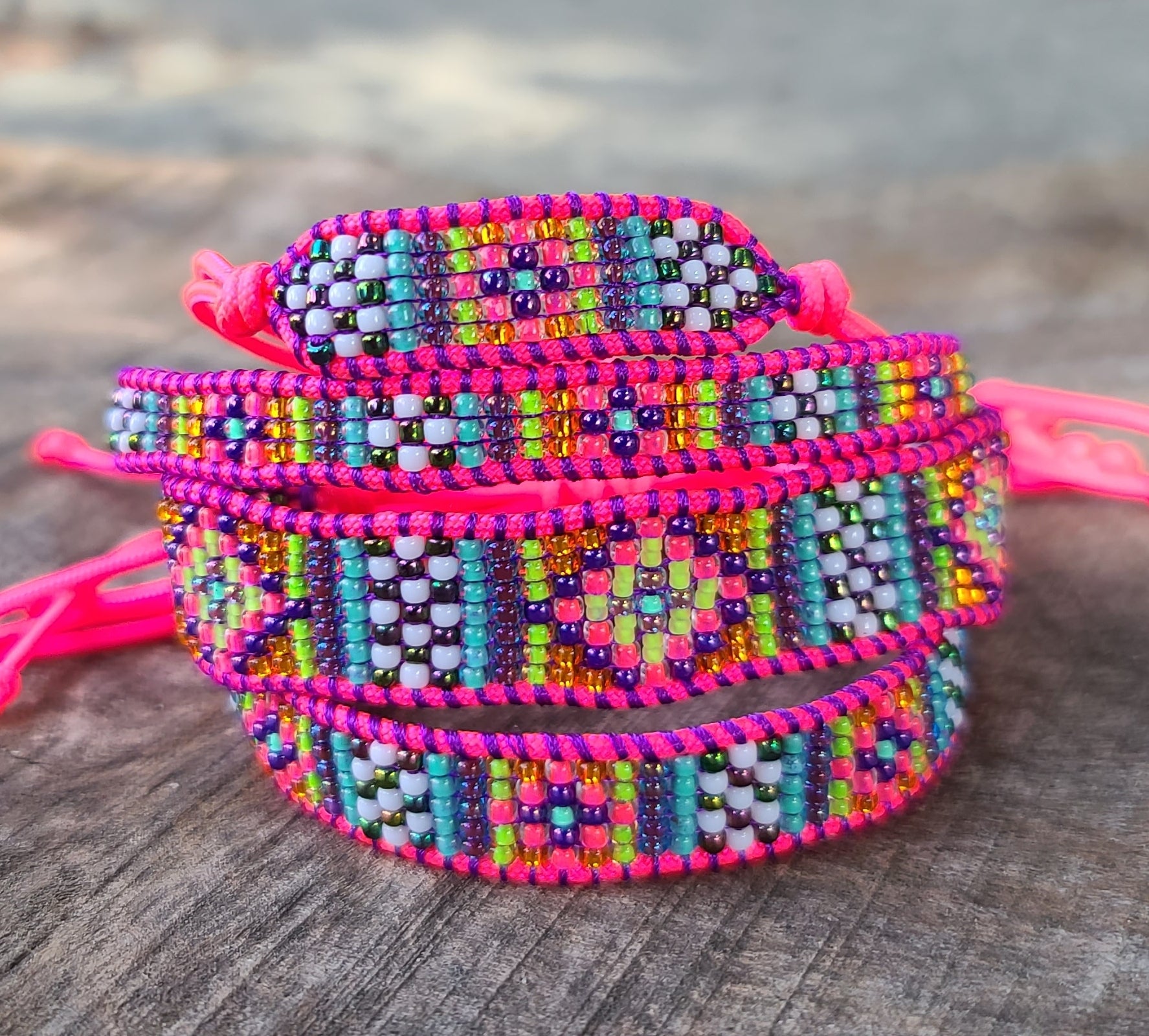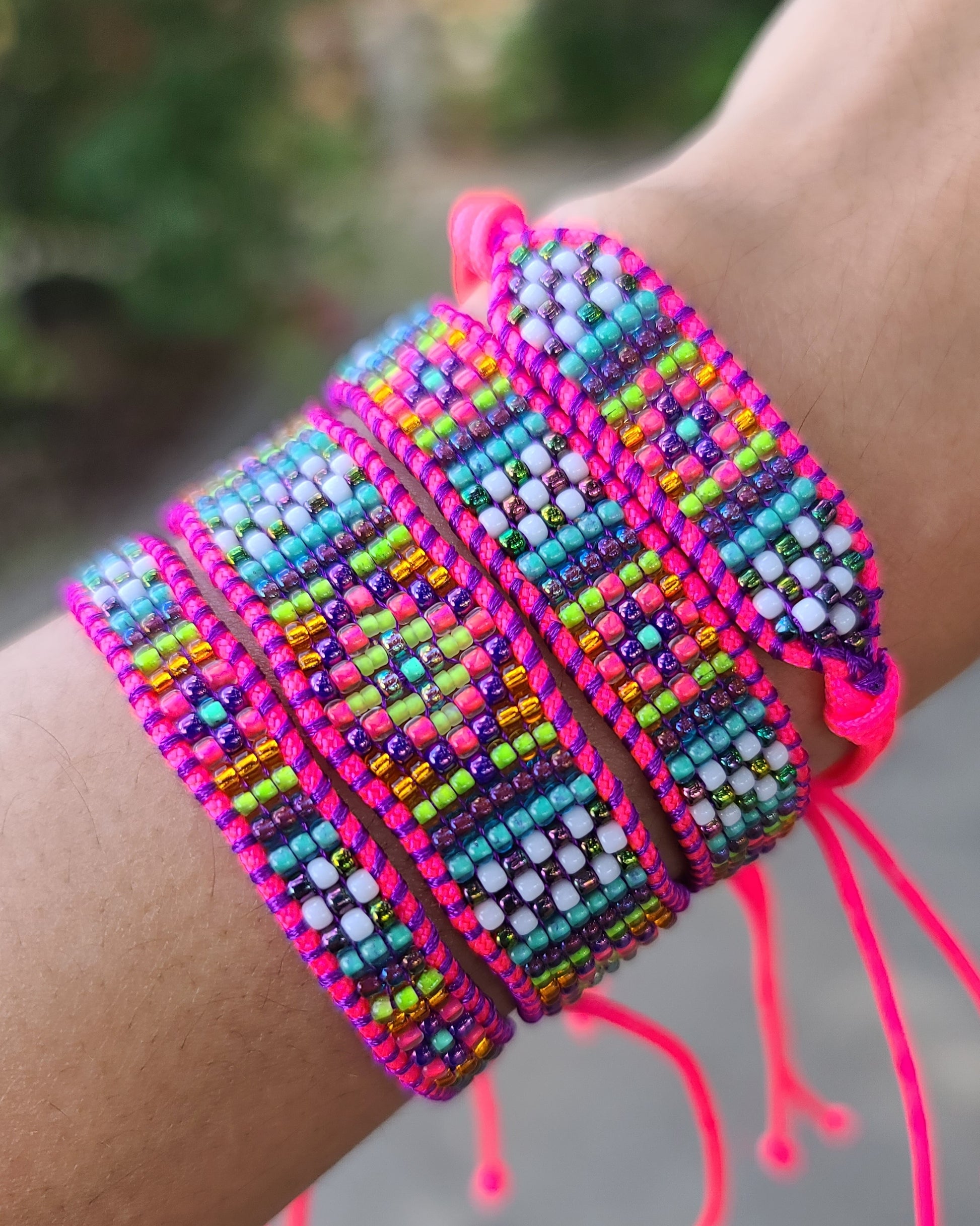 Bracelets feature tiny glass beads arranged in rainbow colors on neon pink nylon cord. This is for the full set of 4 bracelets.