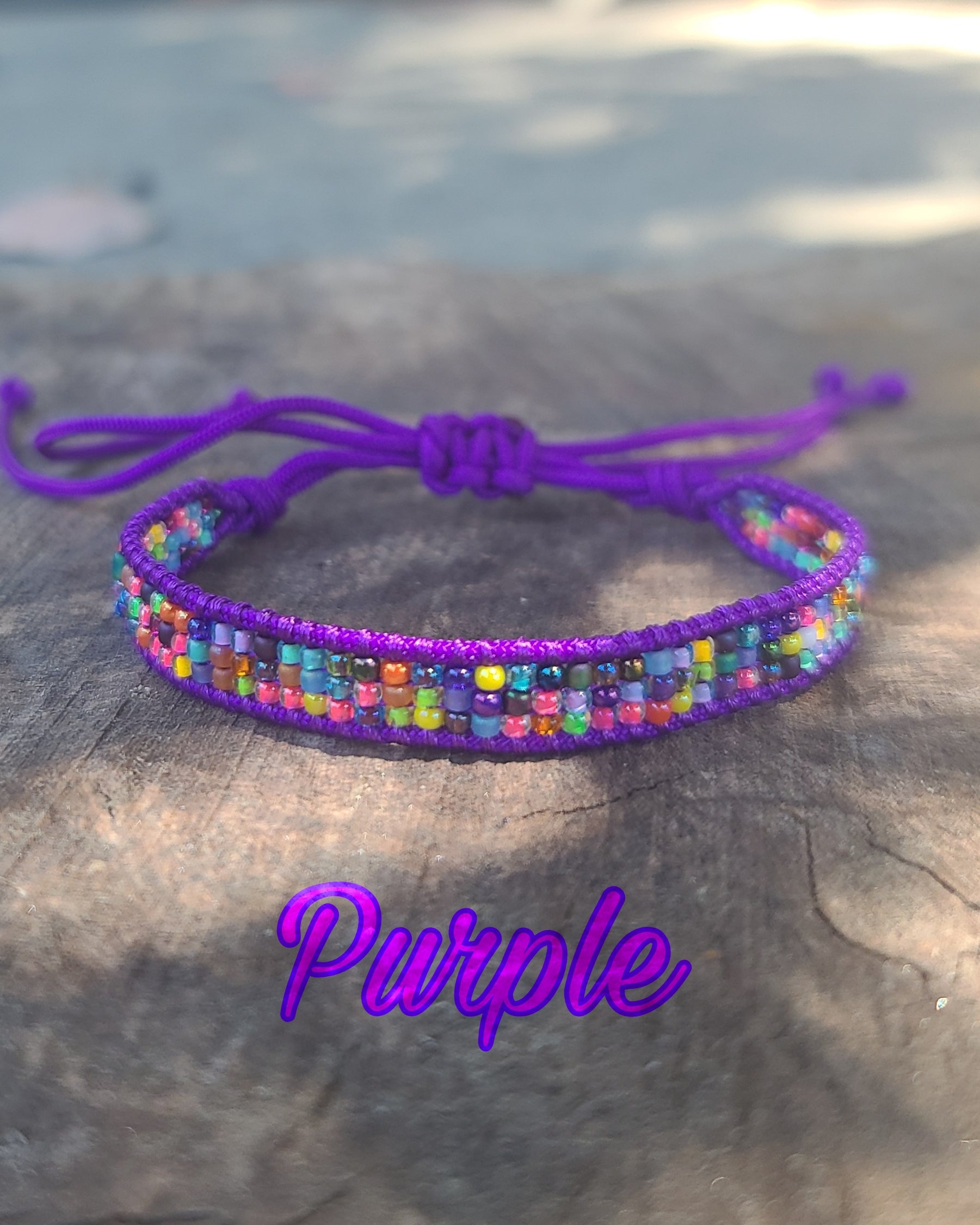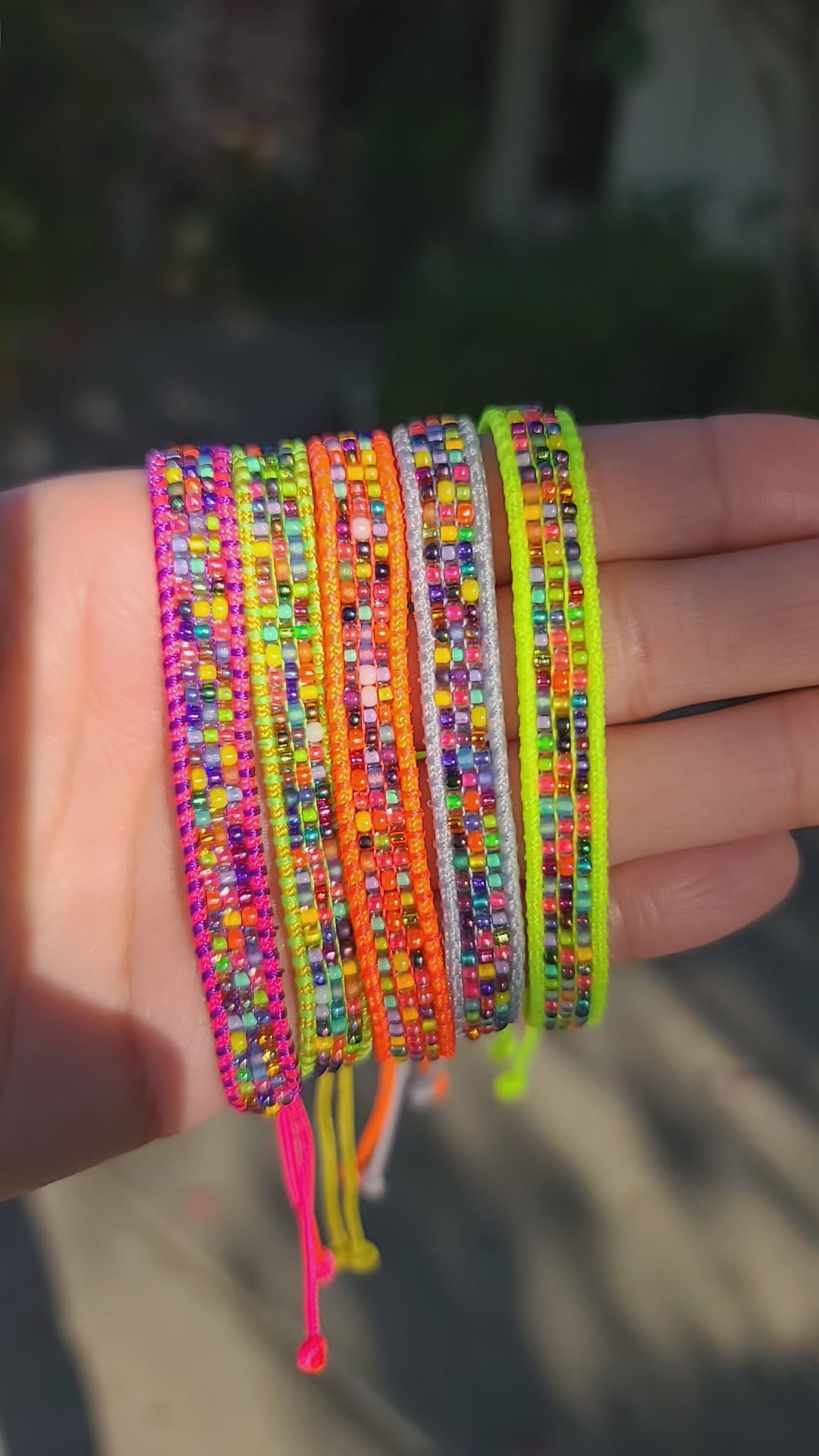This bracelet features tiny glass beads in our rainbow mix colors, intricately woven into nylon cord. Beads are chosen at random.