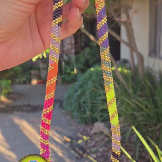 This a handmade, hand woven beaded necklace featuring tiny glass gold beads woven into an array of beautiful colors that are inspired by the California sunset. Perfect for any everyday occasion be it dressy or casual.